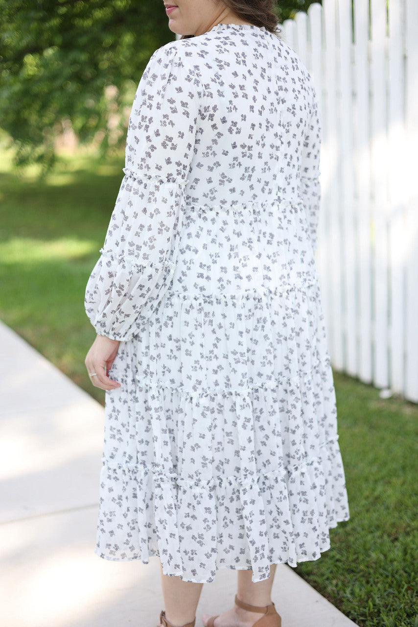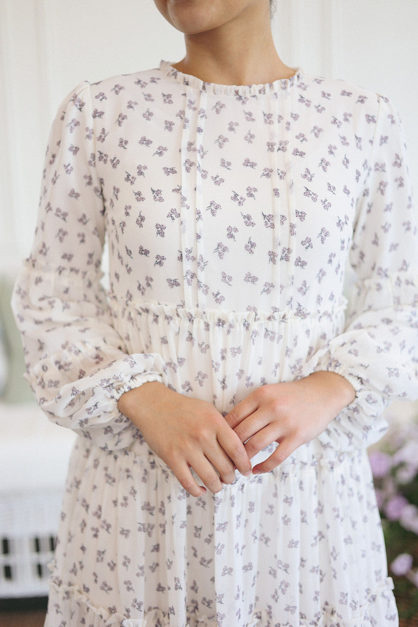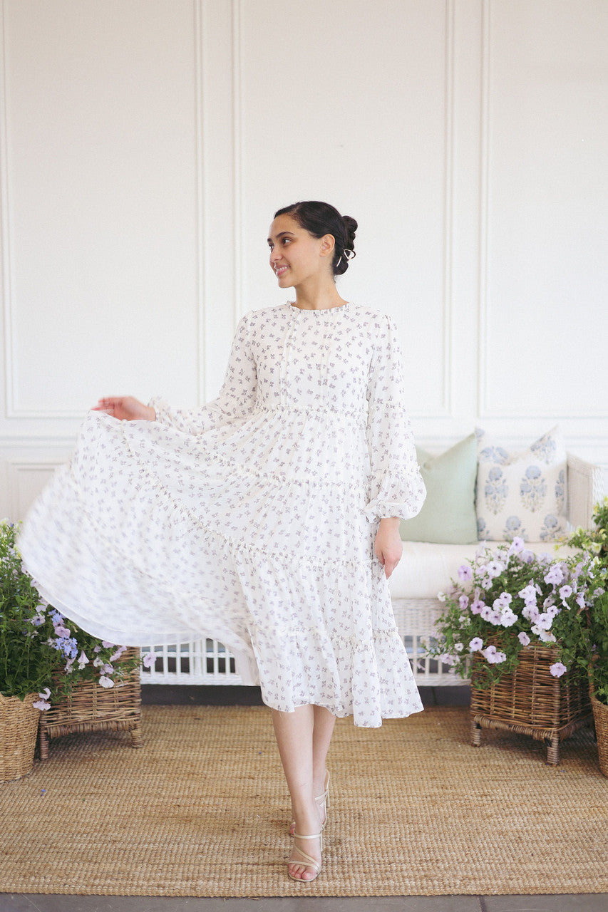 Our bestselling silhouette - the Bella, is back in a beautiful new print for the season! This dress is flattering and feminine on ladies of all ages and stages of life - it's also one of our most beloved maternity friendly styles. A romantic, vintage feel with elegant sleeves and a tiered skirt made for twirling! A beautiful choice for family photos, Sunday best, weddings and so much more! White background with dainty purple flowers. Back zipper. Lined, no need for additional layering.