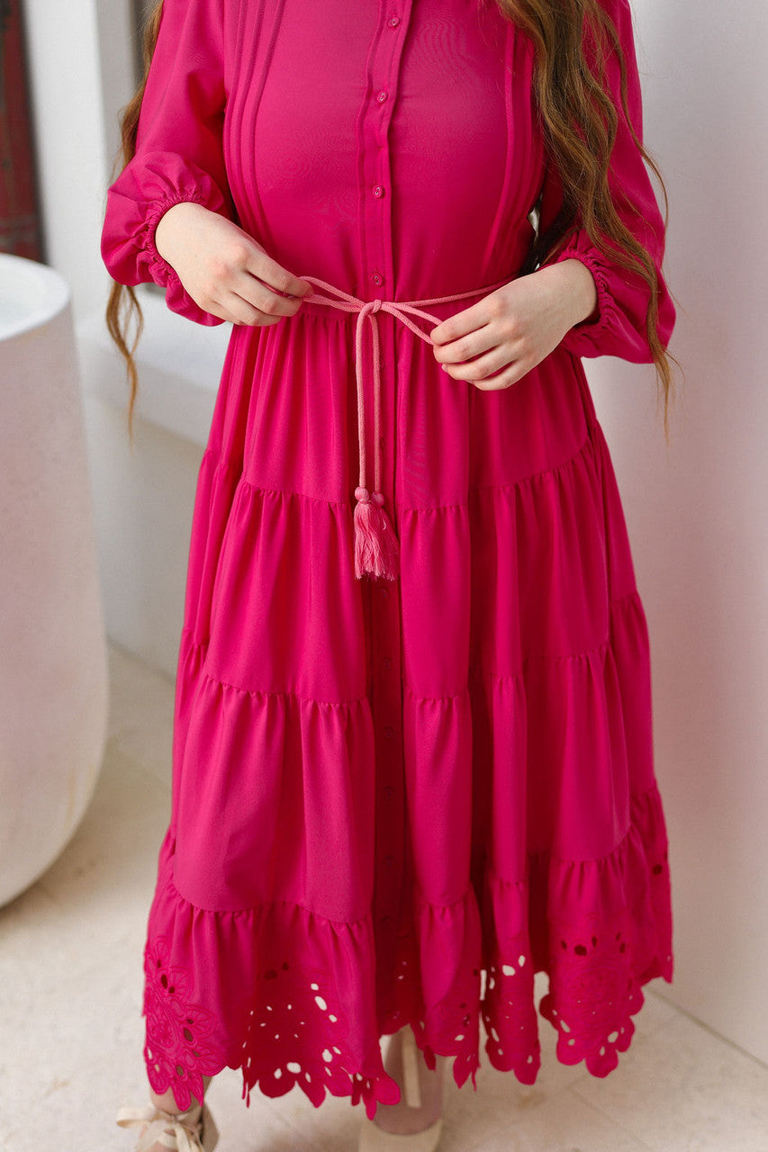 In a word: showstopping! This dress will take your breath away the moment you slip it on! First things first: the hot pink color is gorgeous! It screams summer and gives ladies of all shades a lovey, natural glow. The tassel belt is a subtle pink and we love the contrast; it really pops against the dress! Subtle pleats on the bodice add a touch of texture and elegance and the tiered skirt is what dress dreams are made of! Not only was it designed for the perfect twirl but the eyelet detail along the hem is to die for! It's some of the most gorgeous eyelet we've had to date! The sleeves are breezy and comfortable with elastic around the wrists. We worked so hard to perfect this dress and we just know you're not going to want to take it off once you slip it on! Get ready for a flood of compliments wherever you go! Functional buttons.