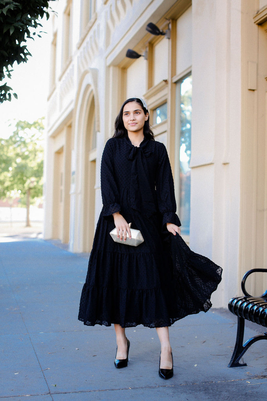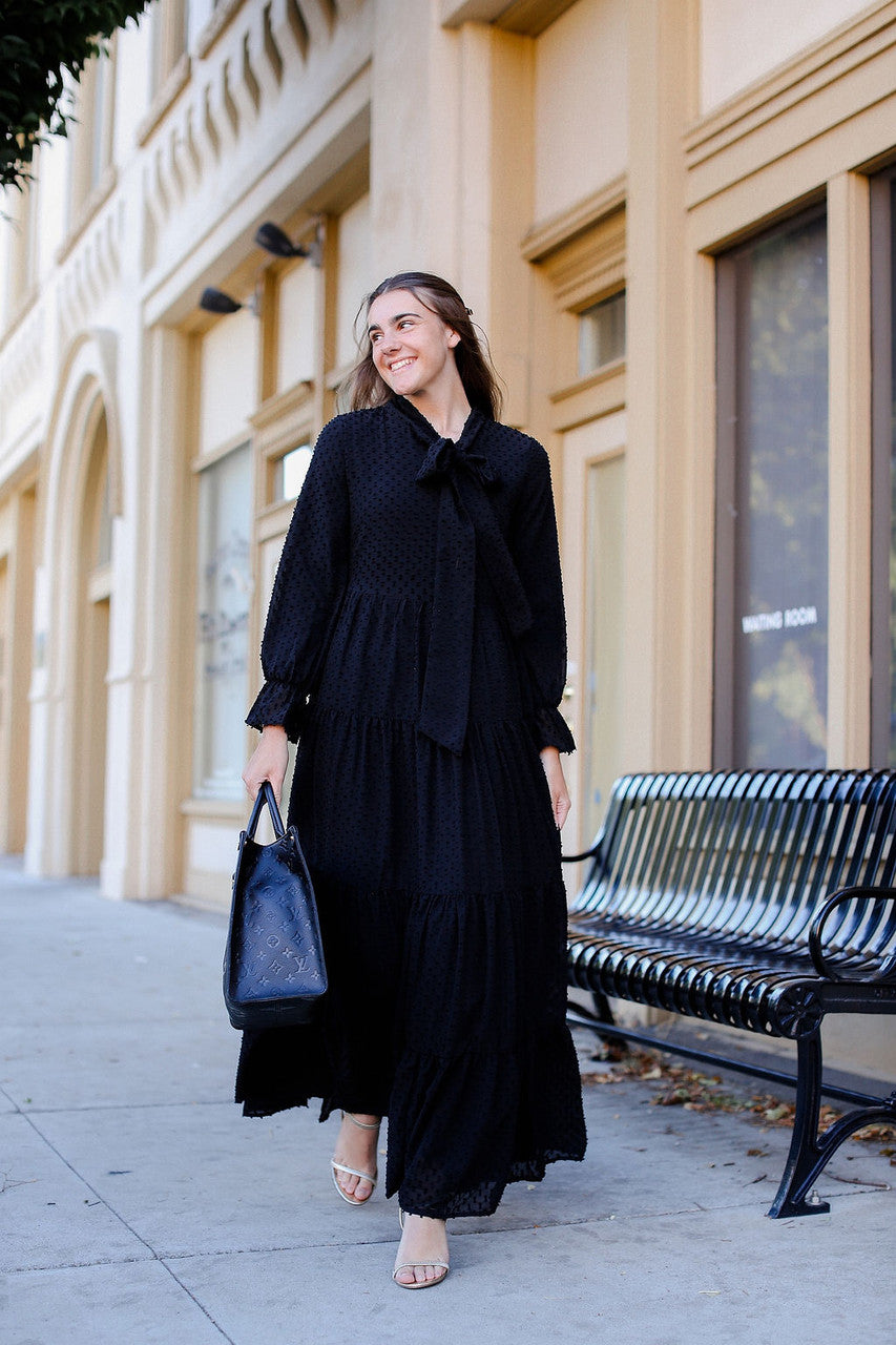 One of your favorites in a new color! Our Radiant Rose & Fields of Lavender Dress is back in chic black! There's nothing quite a sophisticated and stylish as black - you just can't go wrong. This dress is everything you could want and more! Swiss dot chiffon fabric, a tiered skirt made for twirling and a sweet bow at the neck, what more could a girl ask for? This silhouette is incredibly flattering - ladies can't get enough of it! This will be a beloved staple of your wardrobe for many years to come. Side zipper.