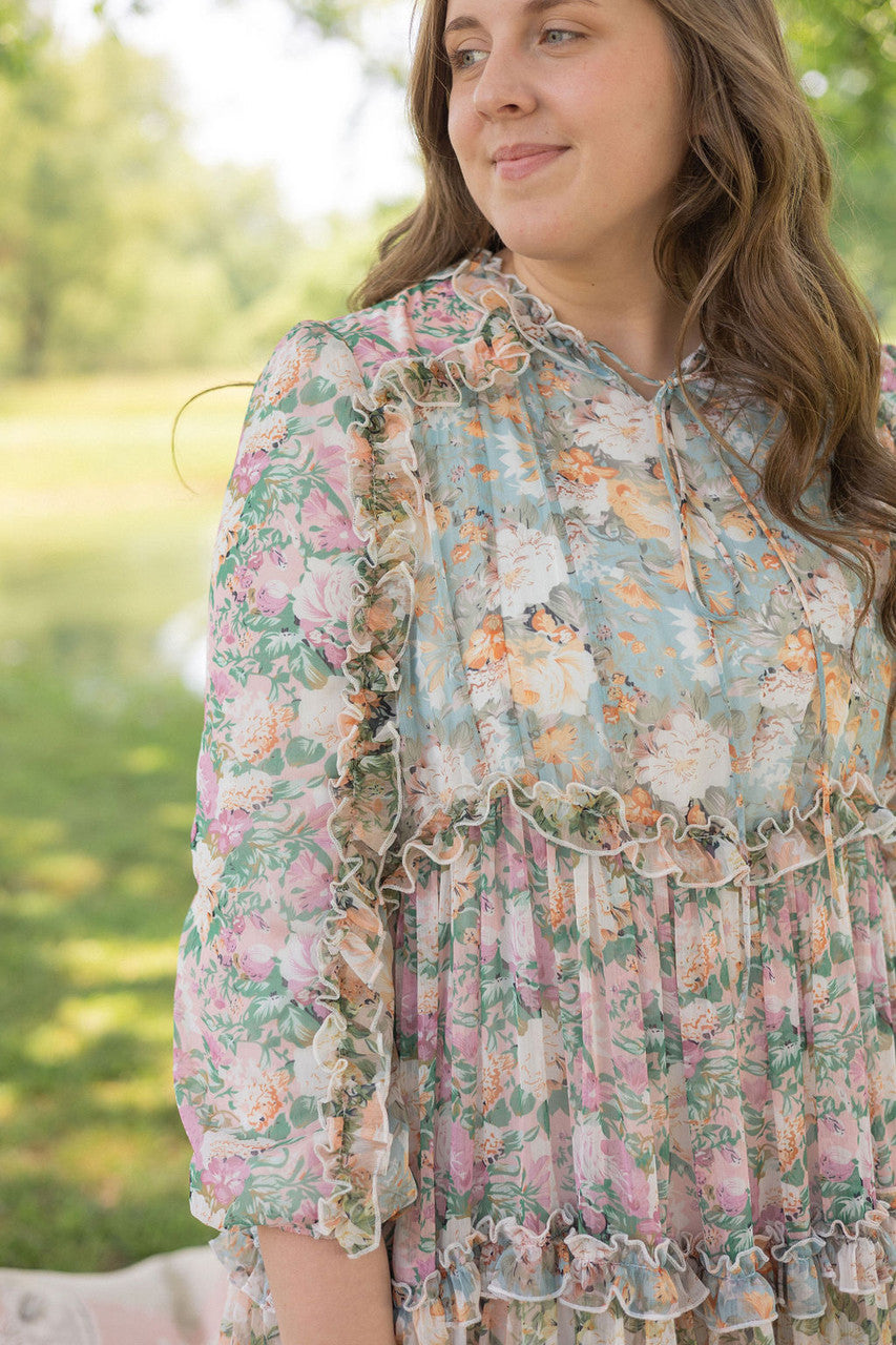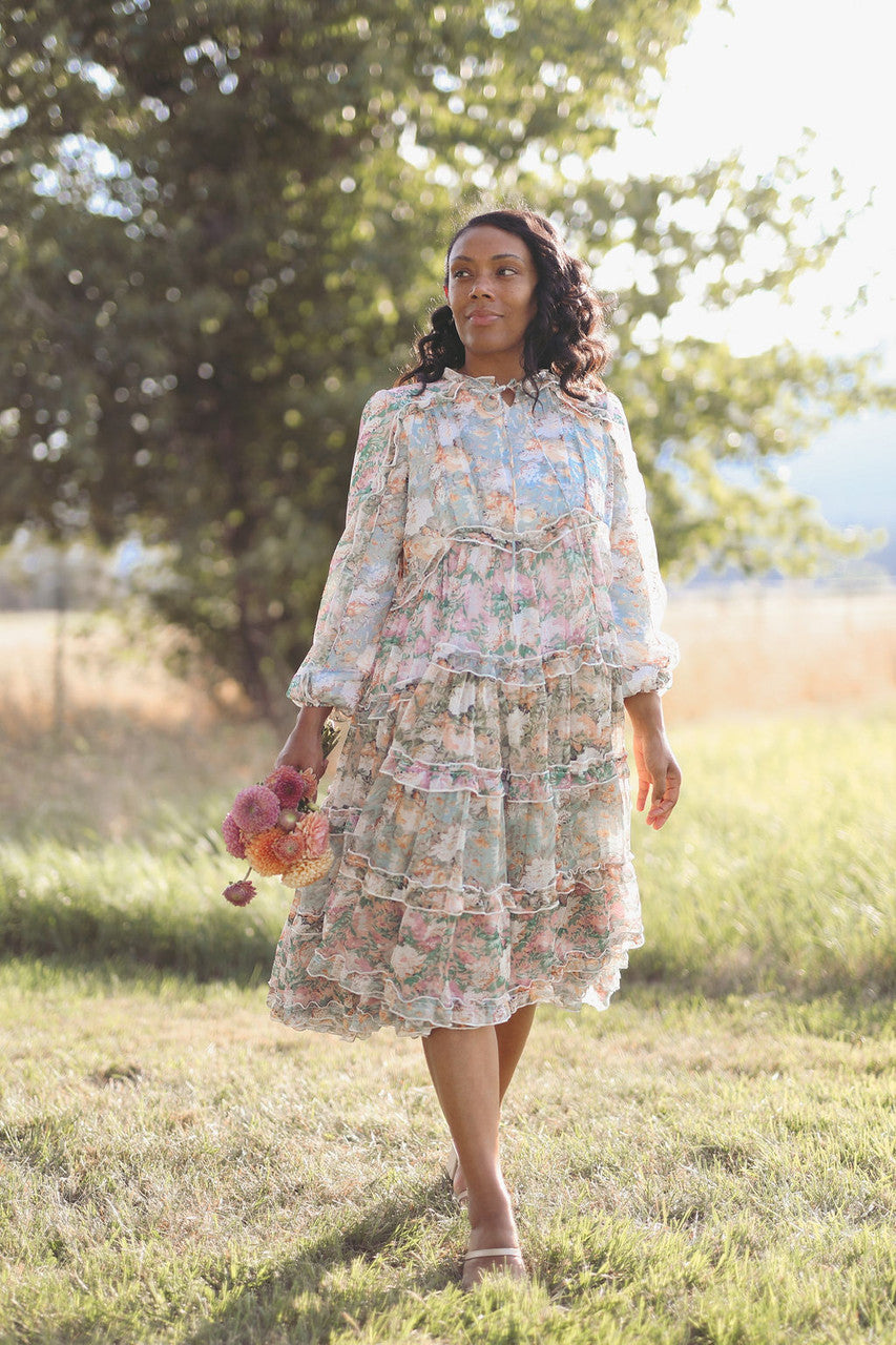 Right out of a storybook - this whimsical dress is a wish come true! It will leave you breathless! Where to even begin, it's beautifully detailed from head to hem! We paired two pastel floral fabrics to create the perfect spring color palette. We made the skirt as flowy as possible - you won't be able to resist taking it for a twirl! Each tier is trimmed with a dainty ruffle for a touch of vintage charm. A simple tie at the neck pulls the whole look together. Trust us, you will be flooded with compliments anytime you wear this stunning piece to spring weddings, garden parties, Mother's Day, Easter & more. Back zipper.