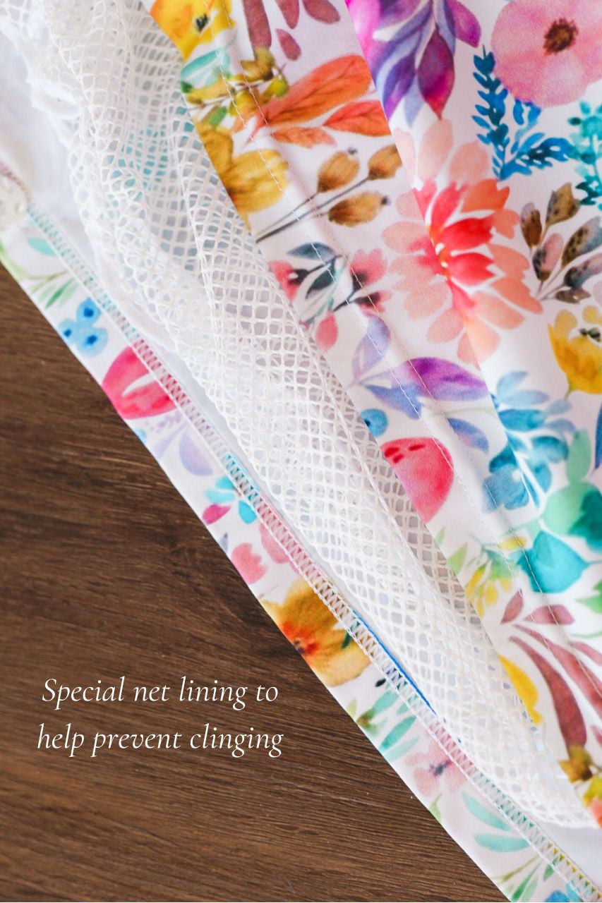 Keep in mind that anything submerged in water is going to cling a little. This swimdress was created to promote modesty while enjoying leisure activities such as light swimming and lounging. May not be appropriate for some extreme forms of exercise and swimming activities. Wash in cold water and hang dry to avoid shrinking and damage.